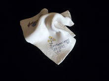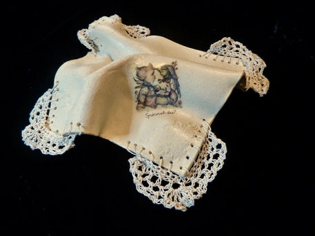 For centuries handkerchiefs have been imbued with meaning, status, sentimentality and function. Girls were taught to embroider handkerchiefs as part of their dowry. In the depression, it was one of the few items a woman could buy to update her look. Literature references how handkerchiefs were used by lovers to communicate. With so much history, a handkerchief is more than a mere scrap of fabric. This series is a work in progress adding my own twist to such a weighty object as I follow it's lead down separate paths.